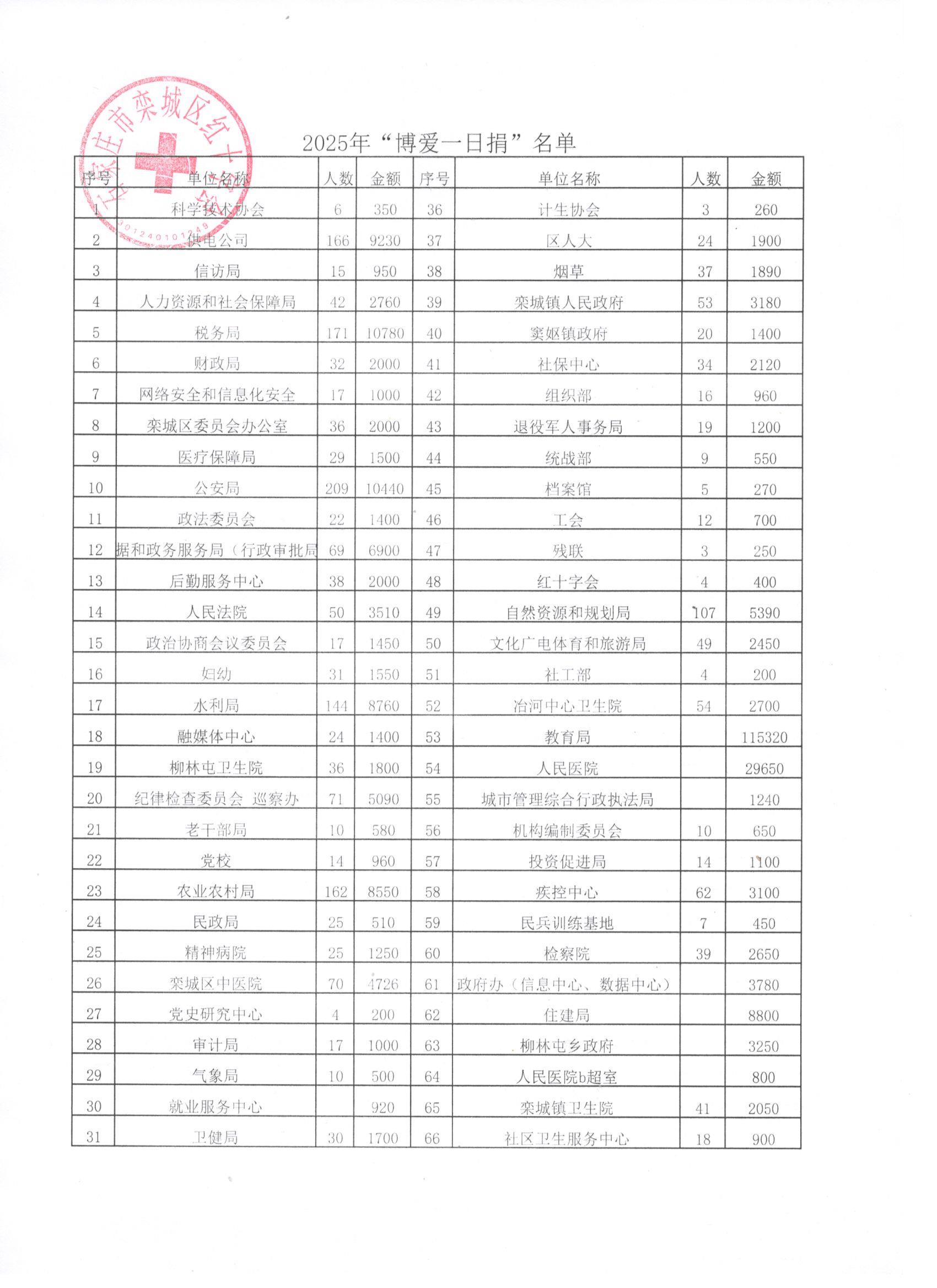 2025年6月,栾城区红十字会在全区范围内开展了2025年“博爱一日捐”活动,各企事业单位积极组织,广大干部职工踊跃捐款,发扬人道、博爱、奉献精神,为区人道救助公益事业贡献力量。截止2025年12月,栾城区红十字共接收“博爱一日捐”捐款305536元,现将接收捐款情况公示如下: